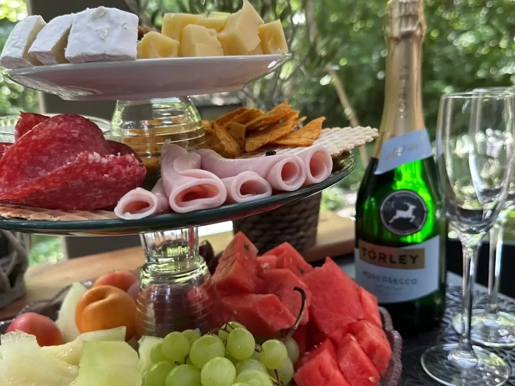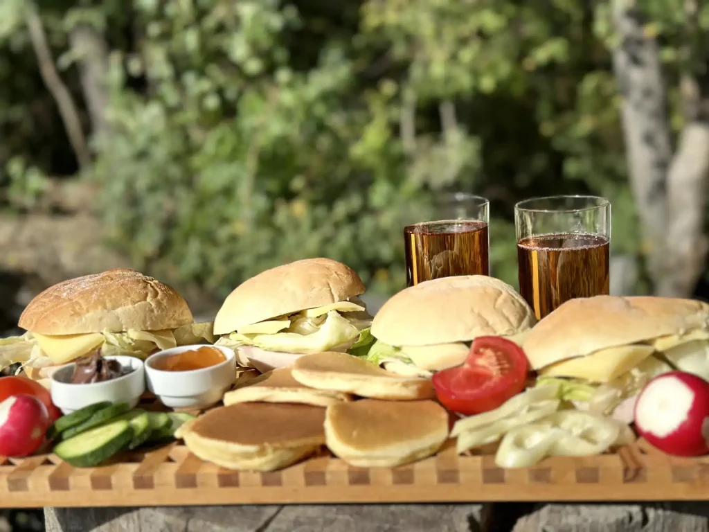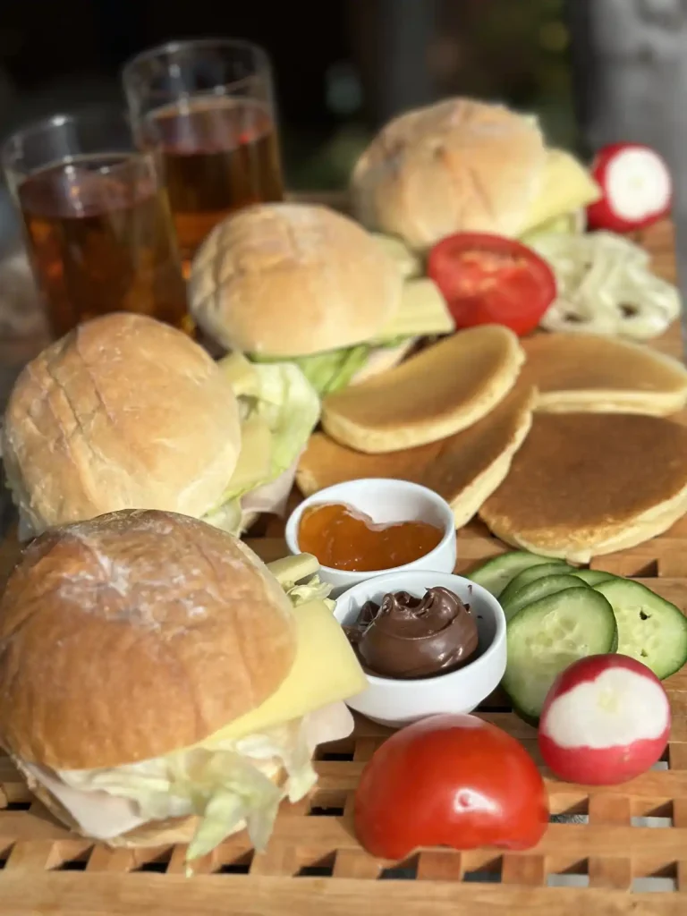 -teavaj, lekvár, zöldségek és egy krém (humusz, padlizsán, körözött)