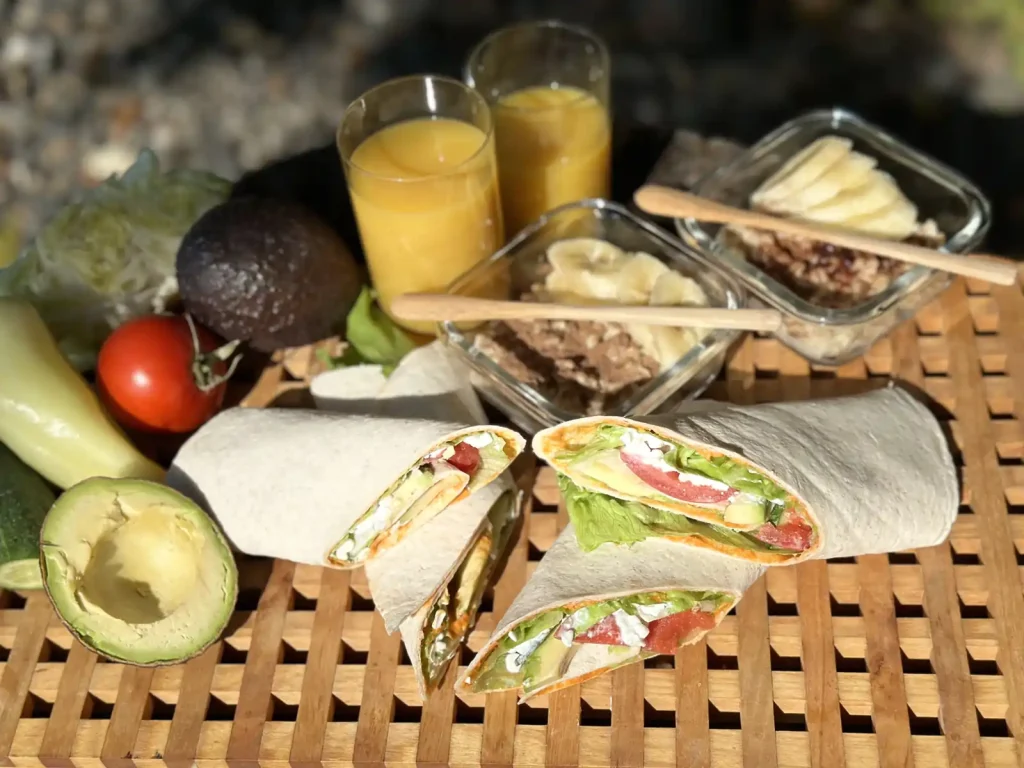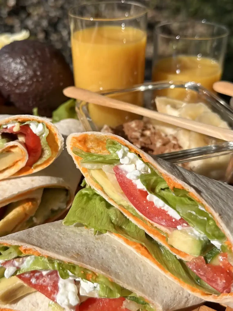 tortilla, jégsaláta, humusz, és sajt, paradicsom, paprika, avokádó.